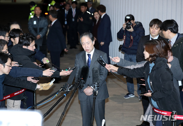 [김포공항=뉴시스]이윤청 기자 = 도미타 고지 신임 주한 일본대사가 3일 오후 서울 강서구 김포국제공항을 통해 입국해 부임 소감을 밝히고 있다. 2019.12.03.