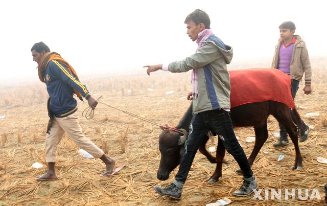 [바리야푸르(네팔)=신화/뉴시스]3일(현지시간) 네팔 바리야푸르 인근 한 사원에서 가디마이 축제가 열려 주민들이 제물로 쓸 송아지를 끌고 축제장으로 향하고 있다. 5년 만에 열려 이틀간 열리는 가디마이 축제는 힌두 여신 가디마이를 기리는 행사로 '대량 동물 도살극'이란 악명을 가지고 있다. 2014년에는 20만 마리의 동물이 도살된 것으로 추정돼 동물보호단체의 비판과 법원 등의 시정 노력에도 축제는 이어지고 있다. 2019.12.04.