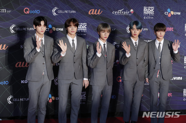 [나고야=AP/뉴시스]그룹 투모로우바이투게더가 4일 일본 나고야의 나고야 돔에서 열린 ‘2019 MAMA’(엠넷 아시안 뮤직 어워즈) 레드카펫 행사에 참석해 인사하고 있다. 2019.12.04.
