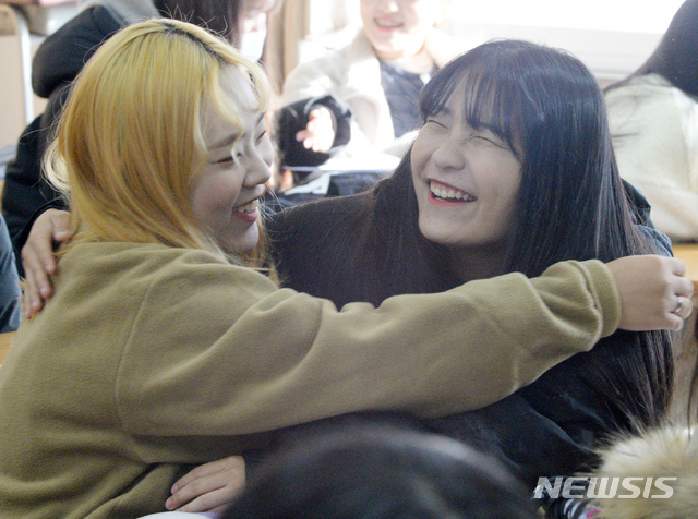 [전주=뉴시스] 김얼 기자= 2020학년도 대학수학능력시험 성적표 배부일인 4일 전북 전주시 호남제일고등학교에서 학생들이 수능 성적표를 확인하고 서로를 안아주고 있다. 2019.12.04.