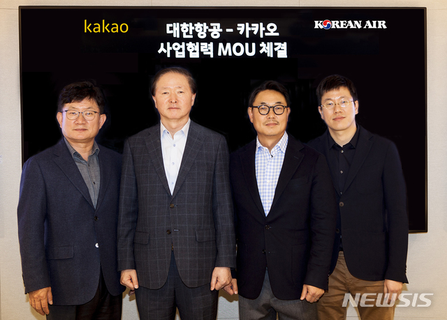[서울=뉴시스]하은용(왼쪽부터) 대한항공 부사장, 우기홍 대한항공 대표이사 사장, 여민수 카카오 공동대표, 배재현 카카오 부사장이 5일 경기도 성남시 분당구 카카오 판교오피스에서 고객가치혁신 및 사업 경쟁력 강화를 위한 사업협력 MOU를 체결한 뒤 기념촬영을 하고 있다. (사진=대한항공 제공) 2019.12.05.