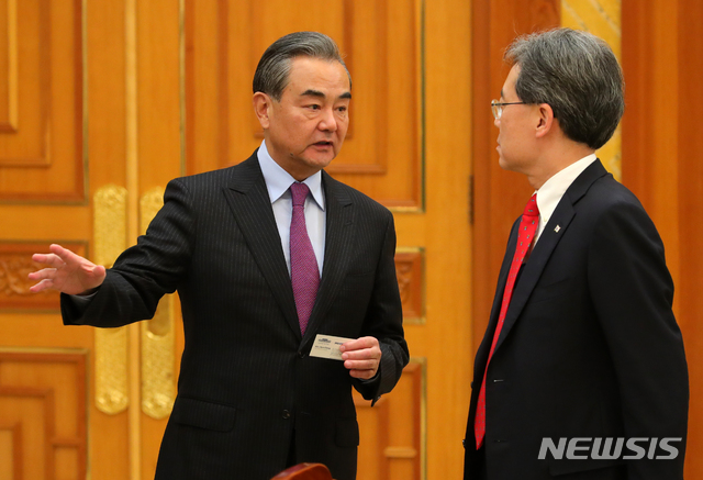 [서울=뉴시스]배훈식 기자 = 왕이 중국 외교부장이 5일 청와대에서 열린 문재인 대통령과의 접견에 참석해 김현종 청와대 국가안보실 2차장과 대화하고 있다. 2019.12.05.