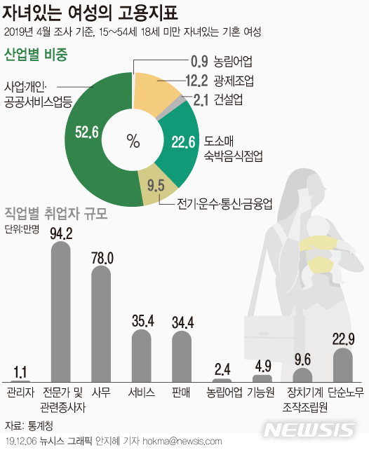 [서울=뉴시스]6일 통계청에 따르면 18세 미만 자녀와 동거하는 기혼 여성 취업자 중 전문가 및 관련 종사자는 1.3% 늘어난 반면 판매 종사자(-5.1%), 서비스 종사자(-4.3%), 사무 종사자(-1.3%) 등은 감소했다. (그래픽=안지혜 기자)