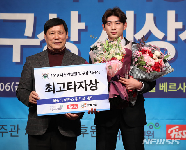 [서울=뉴시스] 김진아 기자 = 이정후 키움히어로즈 선수가 6일 서울 강남구 리베라호텔에서 열린 2019 나누리병원 일구상 시상식에서 최고 타자상을 수상하고 있다. 2019.12.06.