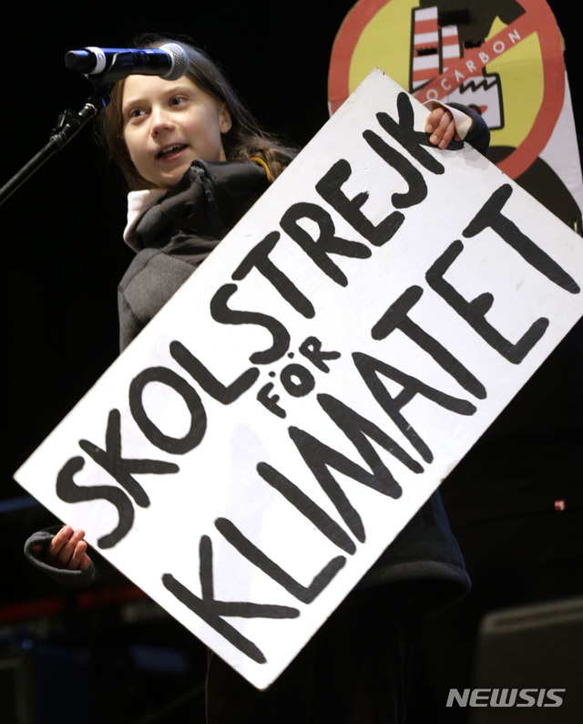 [마드리드=AP/뉴시스]스웨덴 출신의 16세 환경 운동가 그레타 툰베리가 6일(현지시간) 스페인 마드리드에서 열린 기후변화 시위에 참석해 발언하고 있다. 그가 든 푯말에는 '기후를 위한 파업'이라는 문구가 적혀 있다. 2019.12.7.