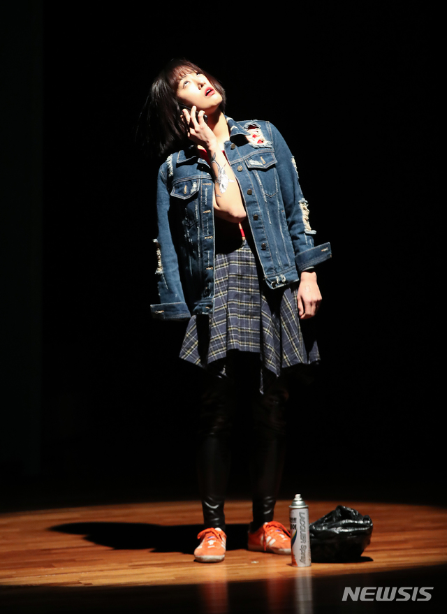 [서울=뉴시스]조수정 기자 = 6일 밤 서울 강남구 역삼동 강남씨어터에서 연극 '범죄소녀들' 15세 비행청소년 유미 역 배우 조혜진이 열연하고 있다. '범죄소녀들'은 범죄를 저지른 청소년이 재판이 완료될 때까지 1개월간 위탁 수용되는 기관인 '소년 분류심사원'에 수감된 소녀들 사이에서 벌어지는 갈등과 화해에 관한 이야기다. 알콜중독자 엄마와 성폭력을 일삼는 새아빠로부터 벗어나고자 가출을 감행한 열 세살 수지는 쉼터에서 만난 재근의 소개로 조건만남을 하다 분류심사원에 수감된다. 그곳에서 각기 다른 이유로 사고를 치고 수감된 나경, 유미, 진영을 만나게 되고 거친 소녀들은 매일 싸우고 으르렁 대지만 점차 서로의 아픔을 나누게 된다. 누구에게도 보호받지 못한 아이들이 범죄에 빠질 수 밖에 없었던 현실을 돌아보고 그들 내면의 분노와 슬픔, 상처에 대해 그렸다. 그들의 이야기를 통해 비행청소년에 대한 이해와 소통을 마련하고자 한다. 극단 필통과 강남문화재단 주관, 서울특별시 후원, 서울특별시 찾아가는 유랑극단 사업 지원으로 제작됐다. 2019.12.06. [email protected]