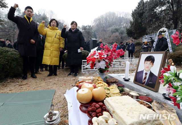 [남양주=뉴시스] 이영환 기자 = 고 김용균 노동자 어머니 김미숙씨, 심상정 정의당 대표 등이 8일 오전 경기 남양주시 마석 모란공원에서 거행된 고 김용균 노동자 1주기 추도식에 참석해 임을위한 행진곡을 부르고 있다. 2019.12.08.