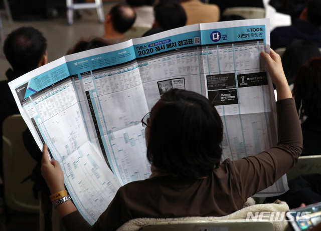 [서울=뉴시스] 이영환 기자 = 한 수험생 학부모가 8일 오후 서울 강남구 진선여고 회당기념관에서 열린 이투스교육 2020학년도 최종 지원 전략 설명회에 참석해 배치표를 살펴보고 있다. 2019.12.08.