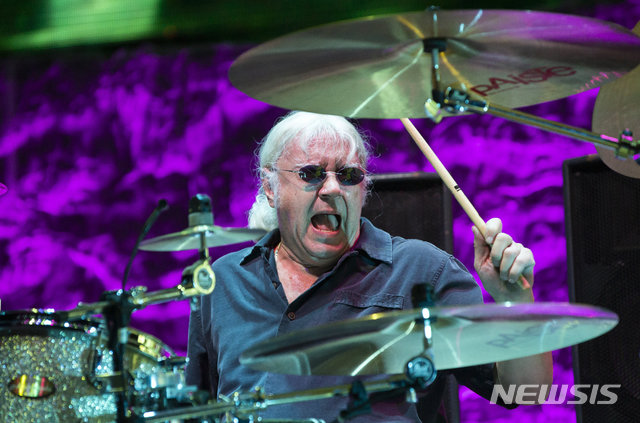 [부다페스트=AP/뉴시스]영국 록밴드 '딥 퍼플'(Deep Purple)의 콘서트가 9일(현지시간) 헝가리 수도 부다페스트의 팝라즐로 경기장에서 열려 이안 페이스가 드럼 연주를 하고 있다. '딥 퍼플'은 '레드 제플린'(Led Zeppelin), '블랙 사바스'(Black Sabbath)와 함께 영국 하드록&헤비메탈을 대표하는 밴드로 꼽힌다. 2019.12.10.