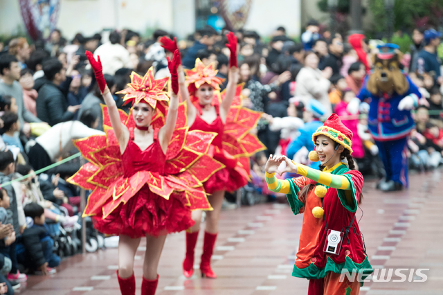 [서울=뉴시스]지난 9일 서울 송파구 롯데월드를 방문한 방문객들이 롯데월드 어드벤처 겨울 시즌 축제의 하이라이트인 ‘해피 크리스마스 퍼레이드’ 공연을 즐기고 있다. (사진=롯데월드 제공) 2019.12.10.