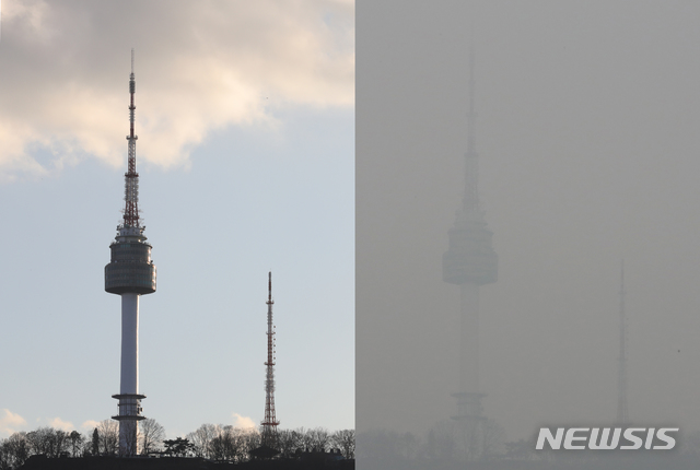 [서울=뉴시스]김근현 수습기자 = 초미세먼지 '매우 나쁨', 미세먼지 '나쁨' 수준으로 수도권에 두 번째 비상저감조치가 내려졌던 11일 서울 중구 퇴계로의 한 빌딩 옥상에서 바라본 N서울타워의 오전 9시53분께 모습(사진 오른쪽)과 미세먼지가 걷힌 오후 4시15분께의 모습이 다르다. 2019.12.11.