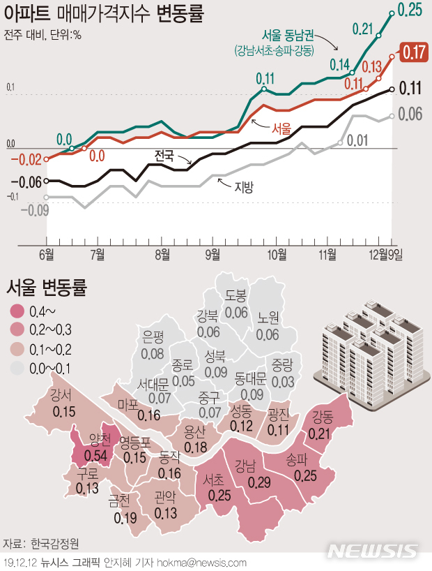 [서울=뉴시스]12일 한국감정에 따르면, 12월 둘째 주 서울 아파트값은 0.17% 올라, 전주(0.13%) 대비 또다시 오름폭이 커졌다. (그래픽=안지혜 기자)