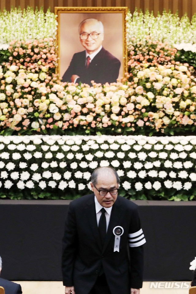 [수원=뉴시스]김종택 기자 = 12일 오전 경기도 수원시 아주대병원 별관에서 엄수된 故 김우중 전 대우그룹 회장의 영결식에서 김 전 회장의 장남인 김선협씨가 인사를 마치고 단상을 내려오고 있다. 2019.12.12.