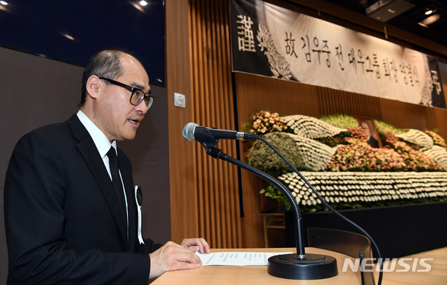 [수원=뉴시스]김종택 기자 = 고 김우중 전 대우그룹 회장 영결식이 12일 오전 경기도 수원 아주대학교에서 거행된 가운데 장남 김선협씨가 유가족 인사를 하고 있다. 2019.12.12.