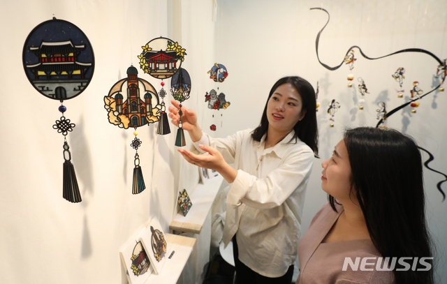 [서울=뉴시스] 전진환 기자 = 2019 공예트렌드페어가 열린 12일 오후 서울 삼성동 코엑스에서 관람객이 한지드림캐쳐를 살펴보고 있다. 2019.12.12.