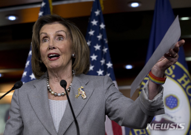 [워싱턴=AP/뉴시스]낸시 펠로시 미 하원의장이 12일(현지시간) 의사당에서 주간 정례 기자회견을 하고 있다. 펠로시 의장은 미 경제 전문지 포브스가 매년 선정하는 '가장 영향력 있는 여성' 3위에 이름을 올렸다. 포브스는 펠로시 의장이 “미국에서 대통령 다음으로 최고위 선출직에 오른 여성”이라고 밝혔다. 2019.12.13.