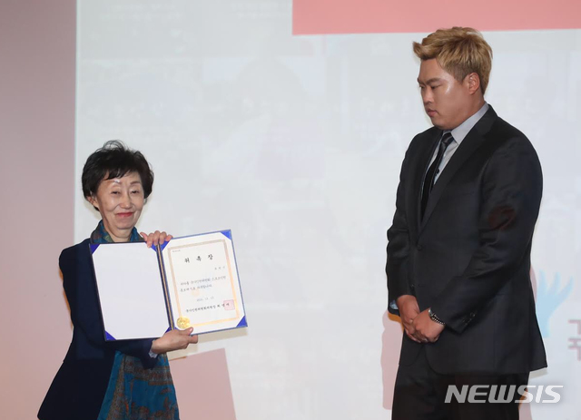 [서울=뉴시스]메이저리거 류현진 선수가 13일 서울 송파구 서울올림픽파크텔에서 열린 국가인권위원회 스포츠인권 선서의 날 행사에서 최영애 국가인권위원장으로부터 스포츠인권 홍보대사 위촉장을 받고 있다. (사진=국가인권위원회 제공) 2019.12.13.