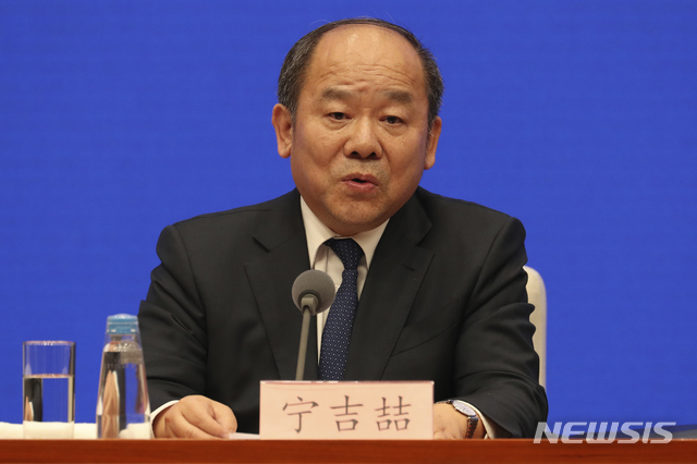 [베이징=AP/뉴시스]중국은 13일 베이징에서 국무원 신문판공실 주도로 긴급 기자회견을 열어 미중 무역협상 1단계 타결을 발표했다. 사진은 닝지저(寧吉喆) 국가발전개혁위원회 부주임이 기자회견에서 발언하고 있는 모습. 2019.12.14