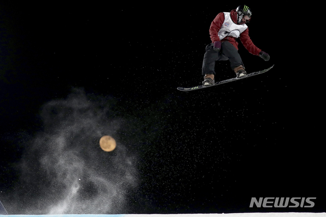 [베이징=AP/뉴시스]다르시 샤프(캐나다)가 14일(현지시간) 중국 베이징의 빅에어 수강에서 열린 2019 국제스키연맹(FIS) 빅에어 월드컵 남자 스노보드에 출전해 달을 뒤로한 채 점프하고 있다. 2019.12.15.