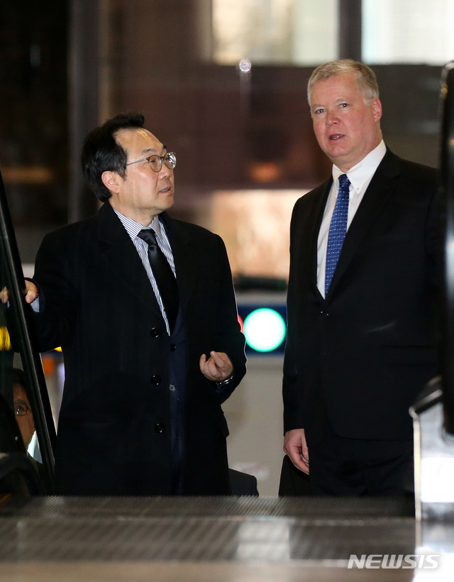 [서울=뉴시스]김선웅 기자 = 스티븐 비건 미 국무부 대북특별대표가 방한 일정을 마친 17일 오후 서울 강서구 김포국제공항을 통해 일본으로 향하고 있다. 왼쪽은 이도훈 외교부 한반도 평화교섭본부장. 2019.12.17.
