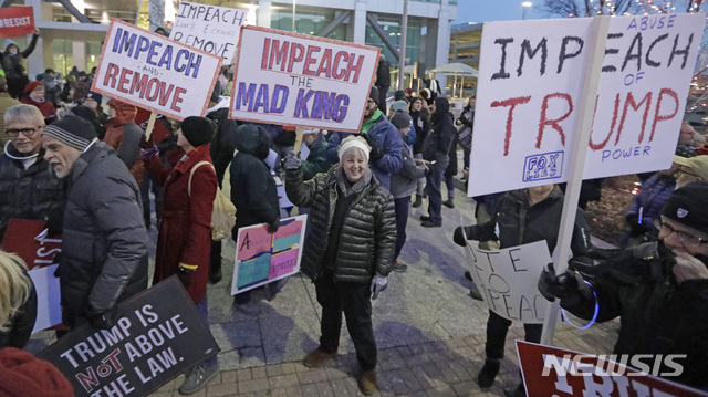 [솔트레이크시티=AP/뉴시스]17일(현지시간) 미 유타주 솔트레이크시티에서 도널드 트럼프 대통령의 탄핵과 퇴진을 요구하는 집회가 열려 시민들이 각종 손팻말을 들고 시위하고 있다. 미 하원의 탄핵소추안 표결이 18일 이뤄질 것으로 알려진 가운데 전날 미국 전역에서 트럼프 대통령 탄핵을 외치는 집회가 열리고 있다. 2019.12.18.