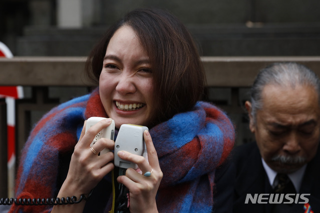 [도쿄=AP/뉴시스]일본 미투 운동의 상징인 프리랜서 언론인 이토 시오리가 18일 일본 도쿄의 법원 밖에서 기자와 지지자들에게 발언하고 있다. 시오리는 2015년 4월에 전 TBS 기자 야마구치 노리유키로부터 성폭행을 당했다고 폭로한 후, 오랜 기간 법정과 법정 밖 투쟁을 이어오다가 이날 소송에서 승소했다. 시오리는 노리유키가 아베 신조 총리와 개인 연락처를 공유하던 몇 안 되는 기자로 이로 인해 체포되지 않았다고 주장해 정치권에도 큰 파장을 일으킨 바 있다. 2019.12.18.