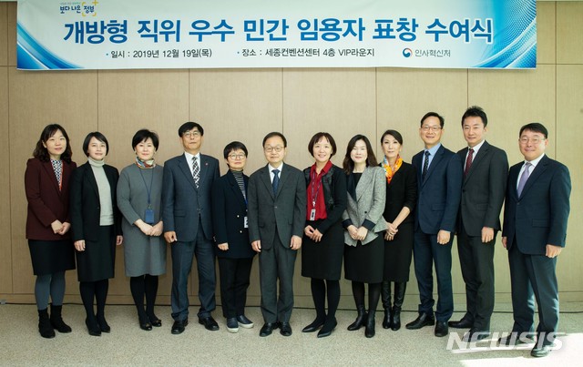 [서울=뉴시스]정만석 인사혁신처 차장이 19일 세종시 정부세종컨벤션센터에서 개방형직위 우수 민간임용자에 대한 표창을 수여하고 수상자들과 함께 기념촬영을 하고 있다. (사진=인사혁신처 제공) 2019.12.19.