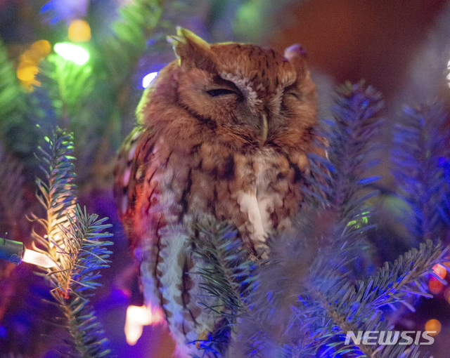 [뉴먼=AP/뉴시스]미 조지아주 뉴먼의 케이티 맥브라이드 뉴먼 가족이 제공한 사진에 이 가족 집안에 설치한 크리스마스트리에 올빼미 한 마리가 앉아 있다. 뉴먼 가족은 홈디포에서 3m 높이의 이 나무를 사 장식한 후 집 안에 설치했는데 그로부터 일주일이 지난 12일(이하 현지시간) 이 나무에 올빼미가 있는 것을 발견했다고 20일 밝혔다. 이 가족은 마트의 트리가 싱싱하고 가지가 많아서 샀는데 올빼미 도 함께 있었던 모양이라며 녀석이 날아가게끔 집안의 문을 열어 놓았지만 날아가지 않아 결국 동물 단체의 도움으로 올빼미를 방사했다고 밝혔다. 2019.12.21.