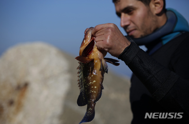 [가자지구=AP/뉴시스]20일(현지시간) 팔레스타인 가자지구 가자 항에서 살렘 아부 아메라라는 남성이 잠수해 잡은 물고기를 들어 보이고 있다. 아메라는 잡은 해산물을 팔아 가족을 부양하는데 그가 이렇게 물질해 하루 버는 돈은 약 15달러(한화 약 1만8천 원)다. 2019.12.21.