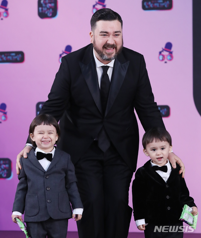 [서울=뉴시스]조수정 기자 =  2019 KBS 연예대상 시상식이 열린 21일 오후 서울 여의도 KBS에서 '슈퍼맨이 돌아왔다' 샘 해밍턴과 아들 윌리엄(왼쪽), 벤틀리(오른쪽)가 레드카펫으로 들어서며 포즈를 취하고 있다. '슈퍼맨이 돌아왔다' 출연 아빠들은 KBS 연예대상 대상을, 아이들은 베스트 아이콘상을 수상했다. 2019.12.21. [email protected]