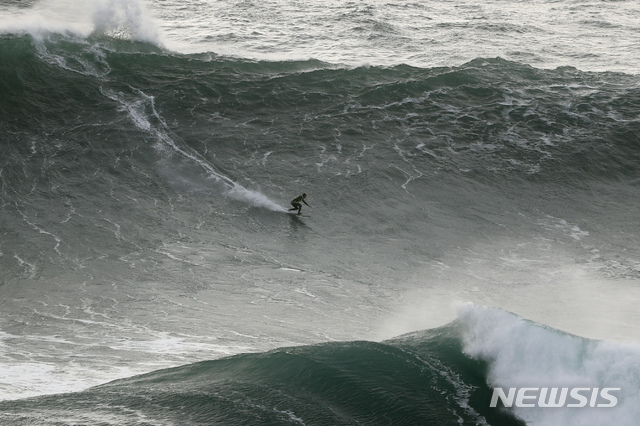[나자레(포르투갈)=AP/뉴시스]22일(현지시간) 포르투갈 해변 도시 나자레의 노스비치에서 한 서퍼가 거대한 파도를 뒤로한 채 파도타기를 하고 있다. 어마어마한 파도가 유명한 나자레는 서퍼들의 '성지'로 알려져 있다. 2019.12.23.