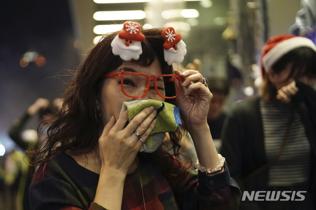 [홍콩=AP/뉴시스] 24일 밤 홍콩의 쇼핑몰에서 한 여성이 최루탄 연기에 고통스러운 표정을 짓고 있다. 이날 도심 곳곳에서 수천명이 민주화 시위를 벌였다. 2019.12.25