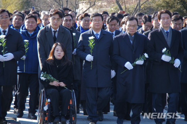 [김해=뉴시스]김상우기자 = 이해찬 더불어민주당 대표 등 당 지도부가 새해 첫날인 1일 오후 경남 김해시 봉하마을 고 노무현 전 대통령 묘역을 참배하고 있다. 2020.01.01