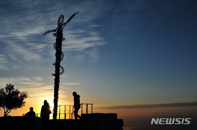 [마다바(요르단)=뉴시스] 채정병 기자 = 31일(현지시간) 느보산 정상에 세워진 모세의 구리뱀 조형물 앞에서 성지순례객들이 저무는 해를 바라보고 있다. 2020.01.01.