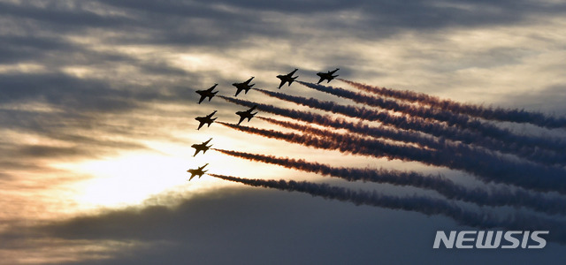[포항=뉴시스] 이무열 기자 = 2020년 경자년(庚子年) 첫날인 1일 오전 경북 포항시 호미곶 해맞이광장에서 공군 특수비행팀인 블랙이글스가 새해 축하 비행을 선보이고 있다. 2020.01.01.