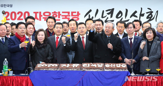 [서울=뉴시스] 장세영 기자 = 자유한국당 박관용 상임고문이 황교안 대표, 심재철 원내대표를 비롯한 참석자들과 함께 1일 서울 영등포 자유한국당 당사에서 열린 2020 자유한국당 신년인사회에 참석해 신년 구호를 외치고 있다. 2020.01.01.