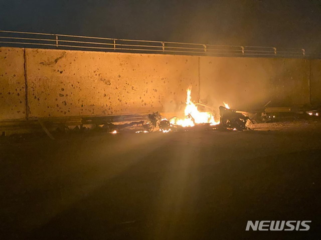 [바그다드=AP/뉴시스]이라크 총리실이 공개한 사진에 3일 새벽(현지시간) 이라크 바그다드 국제공항에서 차량이 공습으로 불타고 있다. 미 국방부는 2일 미군이 트럼프 대통령의 지시에 따라 바그다드 공항을 공습해 이란 혁명수비대 정예부대 쿠드스군을 이끄는 거셈 솔레이마니 사령관이 사망했다고 밝혔다. '쿠드스군'은 시리아와 레바논, 이라크 등 해외의 친이란 무장조직이나 정부군에  혁명수비대의 지원과 지휘를 담당하는 정예 부대다. 2020.01.03.