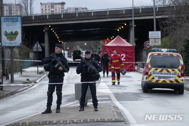 [빌쥐프=AP/뉴시스]3일(현지시간) 프랑스 파리 남쪽 빌쥐프의 한 공원에서 한 남성이 행인들에게 무차별 흉기를 휘둘러 경찰에 사살된 현장에서 경찰이 순찰하고 있다. 오트브뤼에르 공원에서 흉기를 든 남성이 행인들에게 흉기를 휘둘러 1명을 살해하고 2명을 다치게 한 후 도주 중 경찰에 사살됐다. 2020.01.04.