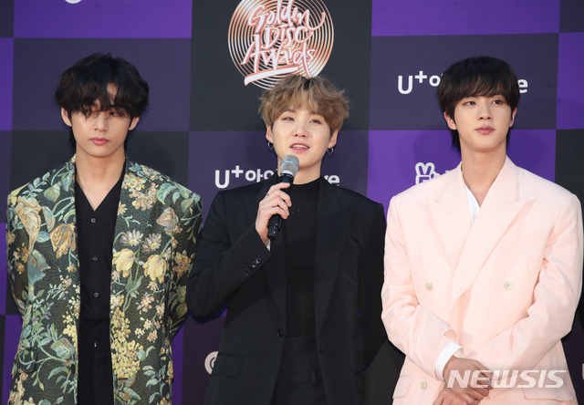 [서울=뉴시스]조수정 기자 = 그룹 방탄소년단이 5일 오후 서울 구로구 고척스카이돔에서 열린 제34회 골든디스크 어워즈 음반부문 시상식에서 레드카펫으로 입장하고 있다. 왼쪽부터 뷔, 슈가, 진. 2020.01.05. [email protected]