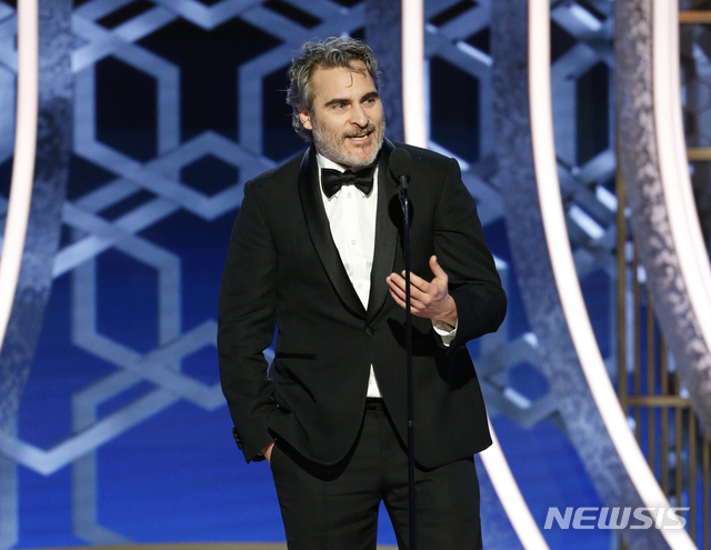 [로스앤젤레스=AP/뉴시스]배우 호아킨 피닉스가 5일(현지시간) 미 캘리포니아주 로스앤젤레스 베벌리힐스의 베벌리 힐튼호텔에서 열린 제77회 골든글로브 시상식에서 영화 '조커'로 드라마 부문 남우주연상을 받고 소감을 말하고 있다. 2020.01.06.