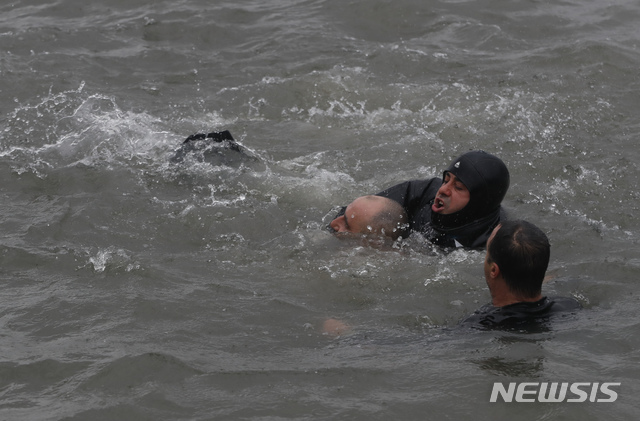 [이스탄불=AP/뉴시스]터키 경찰 잠수부들이 6일(현지시간) 터키 이스탄불에서 열린 공현 대축일 행사로 물속 나무 십자가를 찾으려 수영하다 의식을 잃은 한 동방정교 신자를 끌어내고 있다. 경찰은 이 남성이 병원에서 회복 중이라고 밝혔다. 이날 십여 명의 정교회 남성 신자들이 동방정교회 대주교 바르톨로뮤 1세가 바다에 던진 나무 십자가를 꺼내기 위해 물로 뛰어들었다. 공현 대축일(1월6일)은 동방 박사 세 사람이 아기 예수를 만나기 위해 베들레헴을 찾은 것을 기리는 축일이다. 2020.01.07.