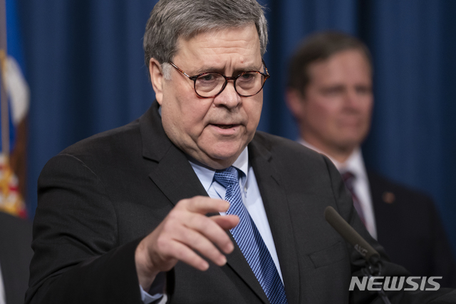 [워싱턴=AP/뉴시스]윌리엄 바 미 법무장관이 13일 법무부에서 기자들에게 미 플로리다주 펜사콜라 해군기지에서 지난달 6일 발생한 사우디아라비아 훈련 생도 모함메드 알샤마니에 의한 총격 사건 조사 결과에 대해 설명하고 있다. 바 장관은 이 사건이 9·11 테러 사건을 일으킨 것과 같은 반미 감정에 의해 촉발된 테러라고 규정하고 미국은 이러한 반미 감정을 가진 사우디 출신 생도 21명을 사우디로 돌려보낸다고 밝혔다. 2020.1.14