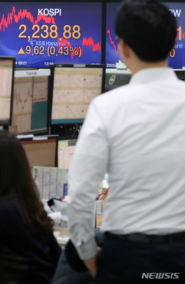 [서울=뉴시스]박주성 기자 = 코스피지수가 전 거래일(2229.26)보다 9.62포인트(0.43%) 오른 2238.88에 마감해 14일 오후 서울 중구 을지로 KEB하나은행 본점 딜링룸에서 딜러들이 업무를 보고 있다. 2020.01.14.