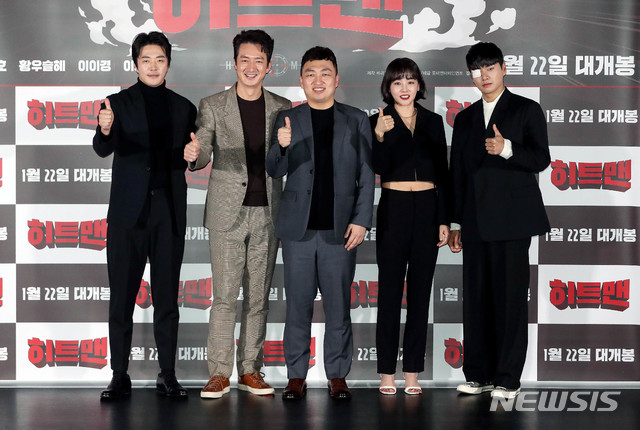 [서울=뉴시스]김병문 기자 = 영화 '히트맨' 배우 권상우(왼쪽부터), 정준호, 최원섭 감독, 황우슬혜, 이이경이 14일 오후 서울 광진구 롯데시네마 건대입구에서 열린 언론시사회에 참석해 포즈를 취하고 있다. 영화 '히트맨'은 오는 22일 개봉한다. 2020.01.14.