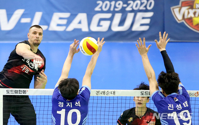 [서울=뉴시스] 이영환 기자 = 14일 수원체육관에서 열린 2019-2020 V리그 한국전력과 대한항공의 경기, 한국전력 가빈이 공격을 하고 있다. (사진=한국전력 배구단 제공) 2020.01.14.