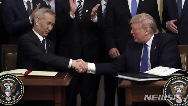 [워싱턴=AP/뉴시스]도널드 트럼프(오른쪽) 미국 대통령과 류허 중국 중앙정치국 위원 겸 부총리가 15일(현지시간) 백악관 집무실에서 미중 1단계 무역 합의안에 서명 후 악수하고 있다. 합의안에는 중국이 앞으로 2년에 걸쳐 2000억 달러(약 231조 6000억 원)어치의 미국산 상품을 추가로 구매한다는 내용 등이 담겼다. 2020.01.16.