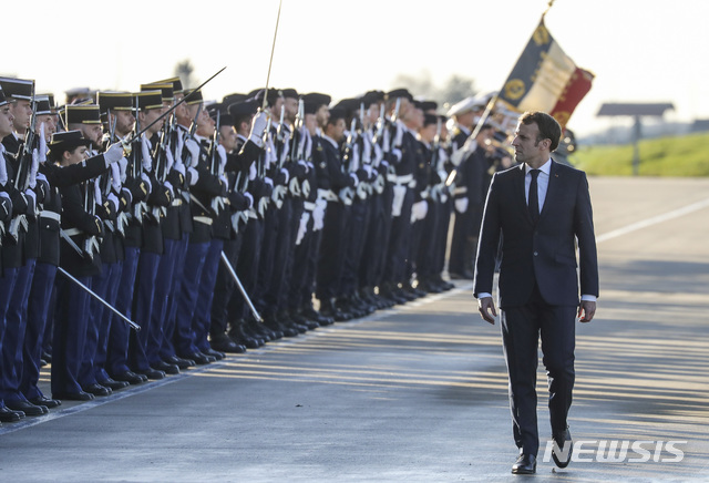 [오를레앙=AP/뉴시스]에마뉘엘 마크롱 프랑스 대통령이 16일(현지시간) 오를레앙의 한 공군기지에서 장병들을 사열하고 있다. 마크롱 대통령은 신년 연설을 통해 중동의 이슬람 극단주의 테러 격퇴전에 핵 추진 항공모함을 재배치할 뜻을 밝혔다. 프랑스는 6년 전부터 미국이 시리아와 이라크에서 주도하는 테러와의 전쟁에 병력을 파병해 IS 격퇴전을 벌여 왔다. 2020.01.17.