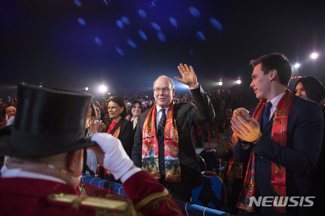 [모나코=AP/뉴시스]모나코 왕자 알버트 2세(가운데)가 16일(현지시간) 모나코에서 열린 제44회 몬테카를로 국제 서커스 페스티벌에 참석해 인사하고 있다. 2020.01.17.