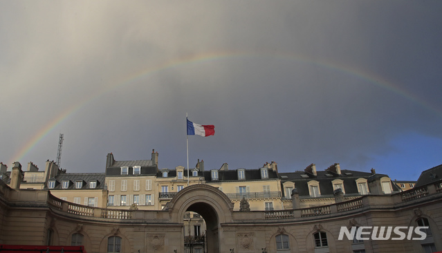 [파리=AP/뉴시스]17일(현지시간) 프랑스 파리의 엘리제궁 위로 무지개가 드리워져 있다. 2020.01.18.