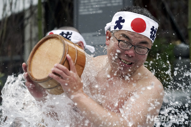 [도쿄=AP/뉴시스]18일 일본 도쿄의 칸다묘진 신사에서 연례 신년 행사가 열려 반라의 남성들이 행사 시작 전 기도하고 있다. 이들은 몸에 찬물을 끼얹어 영혼을 정화하며 한 해의 안녕과 건강을 기원한다. 2020.01.18.